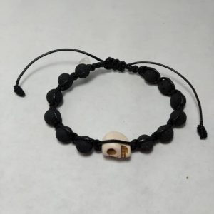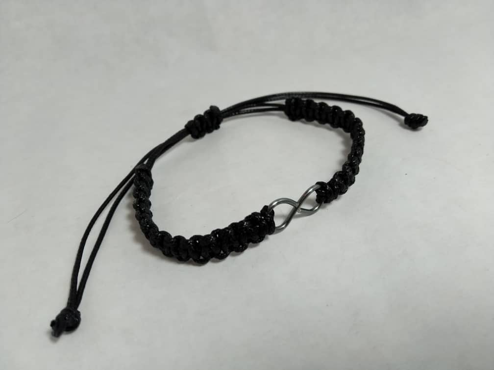 Pulsera tejida en piel de serpiente color negro y dije de infinito en alambre color ematita